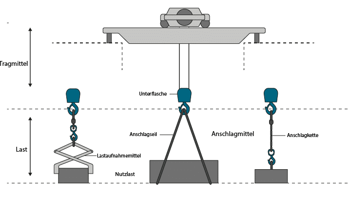 - Spezialanschläge, wie z.B. Kranhaken mit Sicherheitsverschlüssen, die ein Abrutschen der Last verhindern.