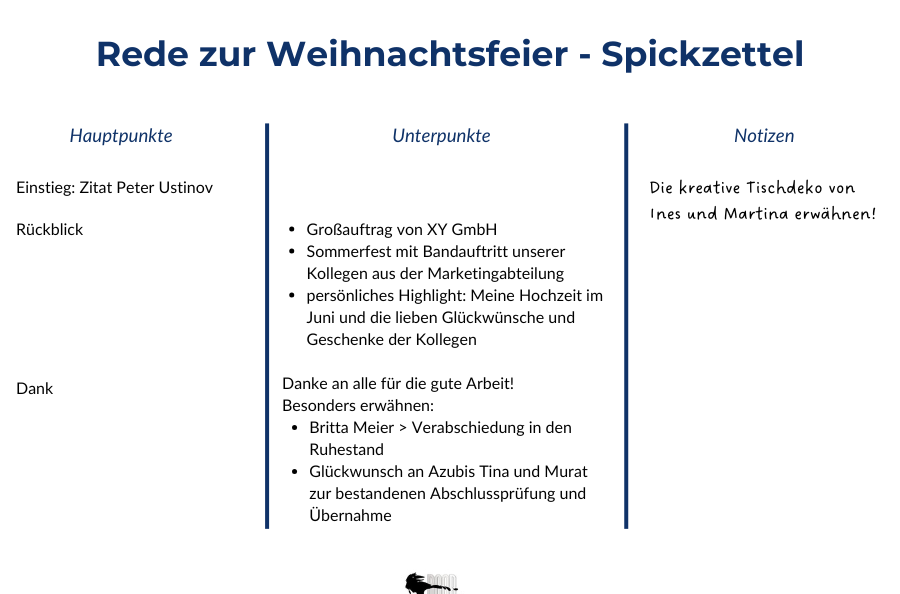 Diese Struktur hilft nicht nur dem Redner, sondern auch dem Publikum, den Gedankengängen leicht zu folgen.