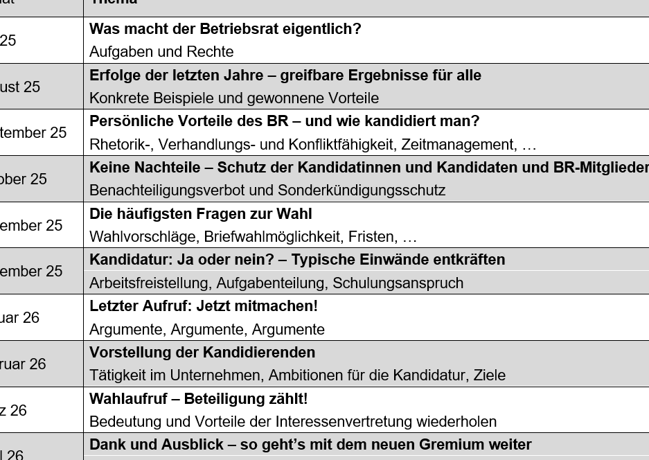Indem wir diese Punkte im Betriebsrat Newsletter einbeziehen, stellen wir sicher, dass unsere Kollegen nicht nur informiert sind, sondern auch aktiv in die Gestaltung ihrer Arbeitsumwelt eingebunden werden.