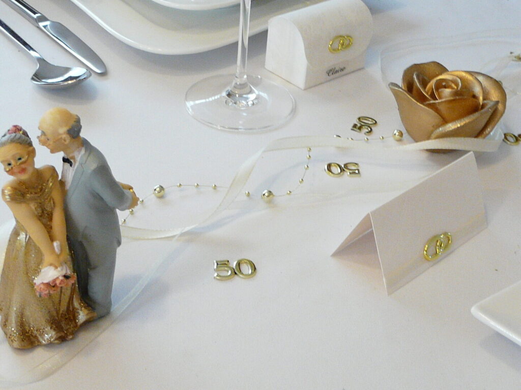 Die Kombination aus Gold- und Cremetönen steht natürlich im Mittelpunkt jeder Feier zur goldenen Hochzeit. Diese eleganten Farben verleihen der Dekoration einen festlichen Glanz. Um ein stimmiges Gesamtbild zu kreieren, können wir folgende Elemente integrieren: