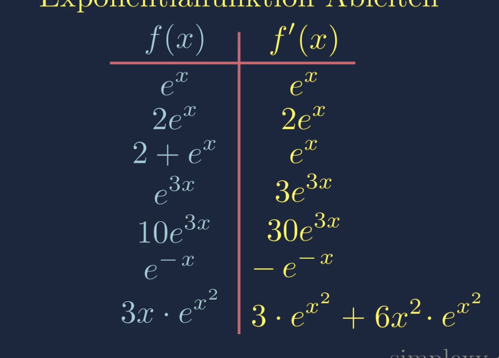 | Funktion ( g(x) ) | Ableitung ( g'(x) ) | Ableitung von ( f(x) = e^{g(x)} ) |