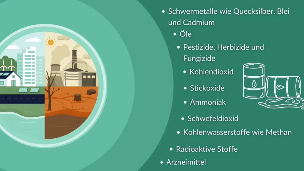 | Schwefeldioxid (SO2) | Verursacht sauren Regen; schädigt Ökosysteme. |