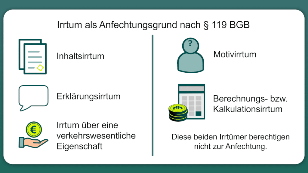 - Rechtsfolgen: Die Rechtsfolgen variieren je nach Art des Irrtums erheblich. Während ein Erklärungsirrtum oft eine Anfechtung ermöglicht und somit zu einem Rücktritt vom Vertrag führen kann, sind andere Irrtümer möglicherweise weniger gravierend und bieten weniger Spielraum für rechtliche Schritte.