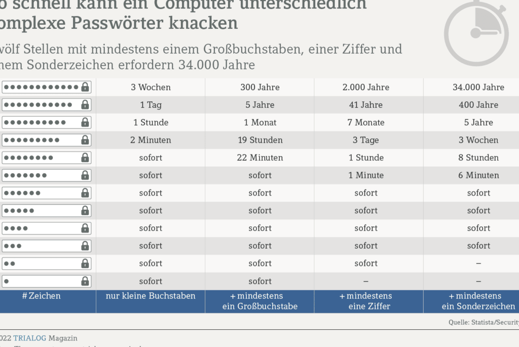 Kurze Passwörter sind schneller erratbar und bieten keinen ausreichenden Schutz vor Brute-Force-Angriffen. Wir empfehlen daher eine Mindestlänge von 12 Zeichen für unsere Passwörter sowie die Verwendung einer Mischung aus Groß- und Kleinbuchstaben, Zahlen und Symbolen. Dies macht es Hackern deutlich schwerer, unsere Kontoinformationen zu entschlüsseln.
