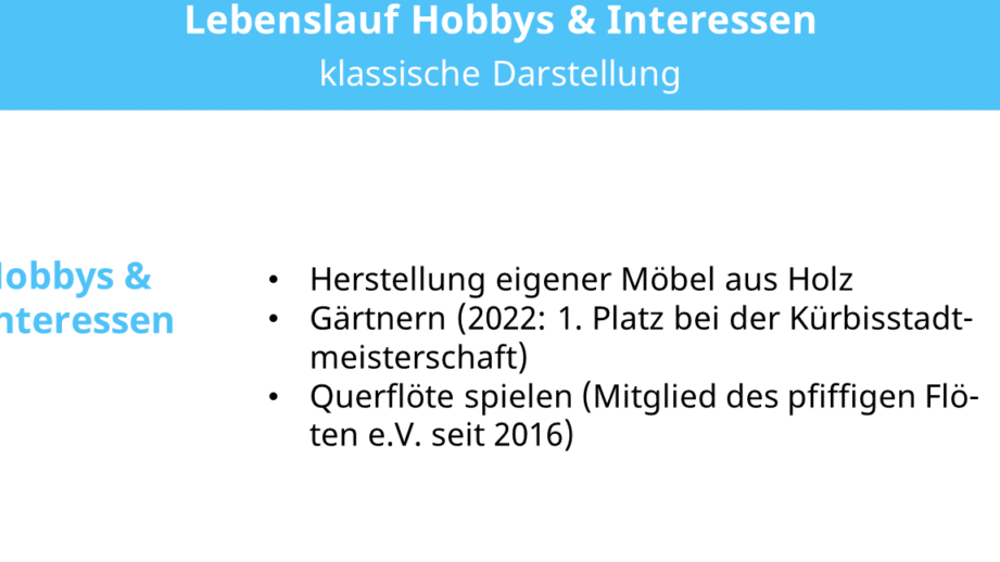 Die Hobbys im Lebenslauf spielen eine entscheidende Rolle bei der Präsentation unserer Persönlichkeit und Interessen. Sie sind nicht nur ein Blickfang für potenzielle Arbeitgeber sondern zeigen auch unsere Soft Skills und Teamfähigkeit. Wenn wir Hobbys geschickt in unseren Lebenslauf integrieren können sie einen positiven Eindruck hinterlassen und uns von anderen Bewerbern abheben.