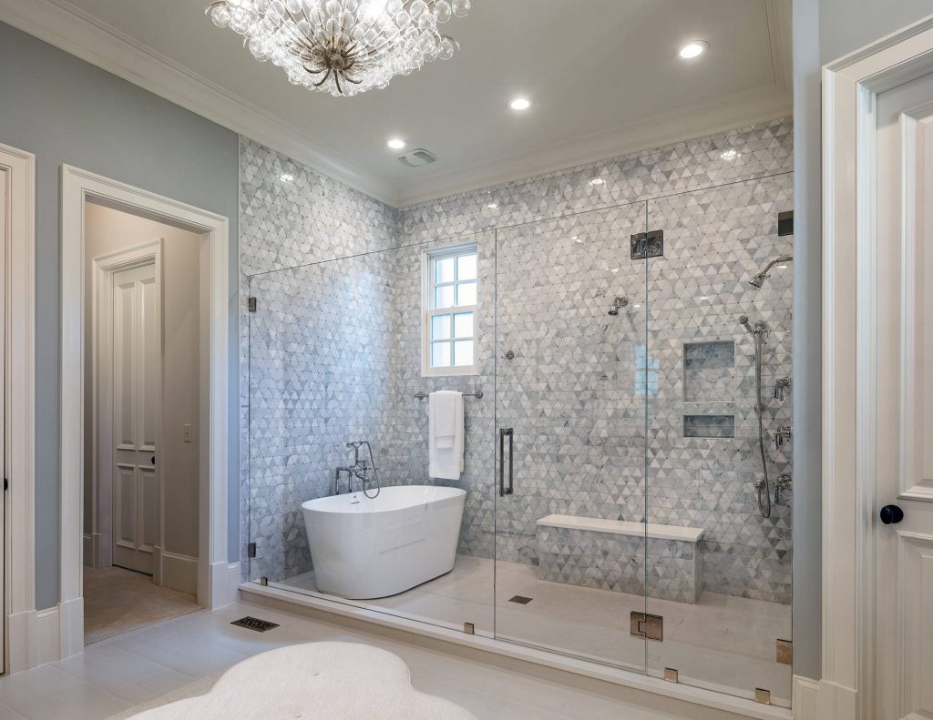 Der Einsatz von Mosaiken in nassen Bereichen unterstreicht die Vielseitigkeit und Eleganz der Gestaltungsmöglichkeiten im Badezimmer.
