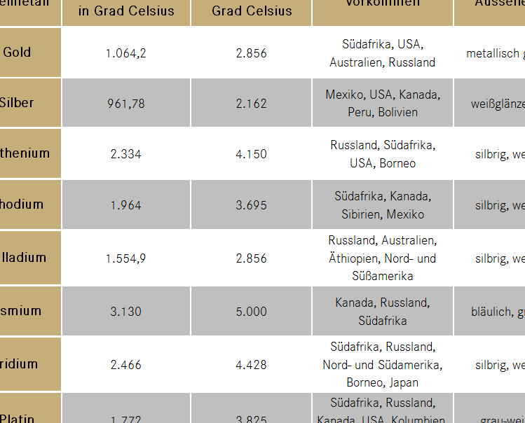 - Rhodium: Hoher Preis, häufig in Katalysatoren und Beschichtungen verwendet.