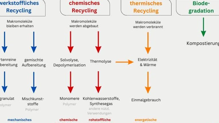 Chemisches Recycling nutzt chemische Prozesse, um Kunststoffe in ihre Grundbausteine zu zerlegen. Dies geschieht oft in mehreren Schritten: