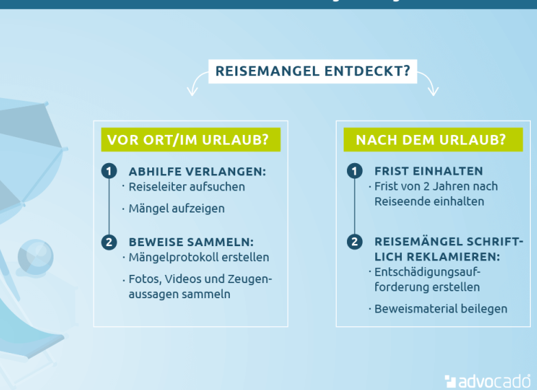 - Mangelanzeige: Wir müssen dem Reiseveranstalter den Mangel unverzüglich melden. Dies kann mündlich oder schriftlich geschehen.
