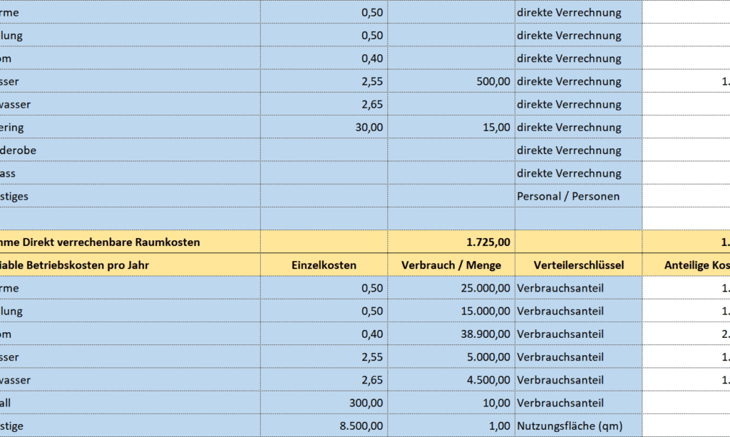Die sonstigen Raumkosten in Mietverhältnissen setzen sich aus verschiedenen Arten von Nebenkosten zusammen, die häufig beim Mieten einer Immobilie anfallen. Diese Nebenkosten können erheblich variieren und sollten bei der finanziellen Planung stets berücksichtigt werden. Zu den gängigen Arten gehören beispielsweise Heizkosten, Wasser- und Abwasserkosten sowie Kosten für Müllabfuhr und Grundsteuer. Es ist sinnvoll, sich über diese Kosten im Klaren zu sein, um unangenehme Überraschungen bei der monatlichen Abrechnung zu vermeiden.