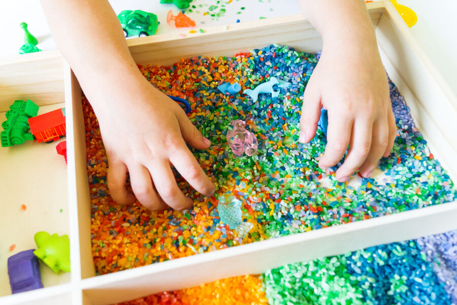 Eine hervorragende Möglichkeit, die taktile Wahrnehmung zu stimulieren, sind selbstgemachte Sensorik-Stationen. Wir können verschiedenen Materialien wie Sand, Wasser oder Stoffe nutzen und diese in Behältern anordnen: