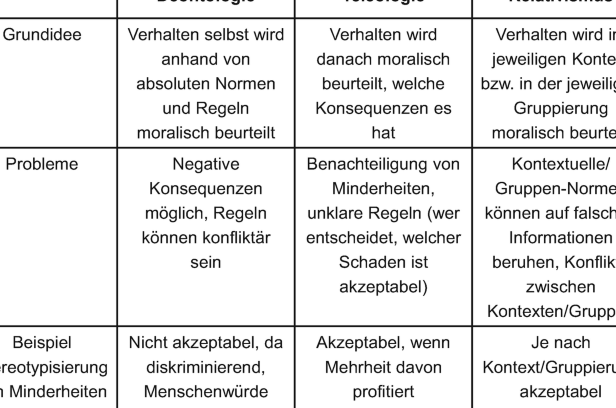 - Utilitarismus: Hierbei steht das Ergebnis einer Handlung im Vordergrund. Eine Handlung gilt als richtig, wenn sie den größtmöglichen Nutzen für die meisten Menschen bringt.