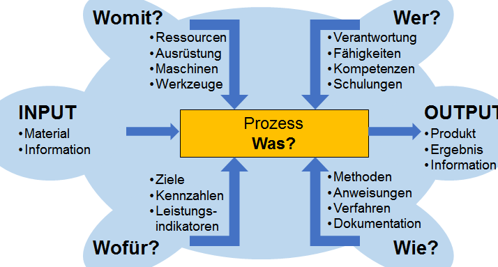 Diese vier Hauptbestandteile sind durch Pfeile miteinander verbunden, um ihre Beziehung zueinander darzustellen und den Fluss des Prozesses zu verdeutlichen.