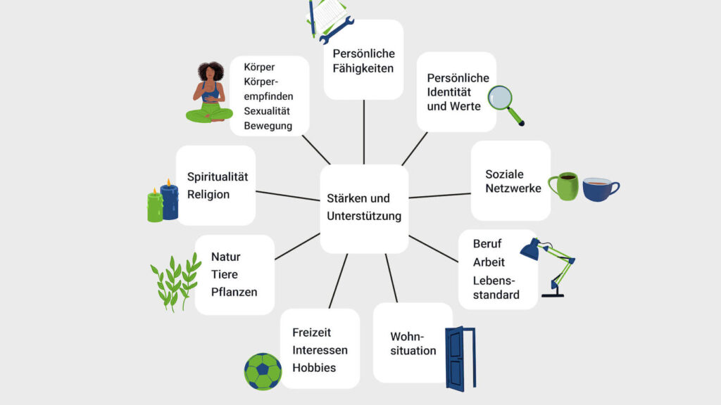Gesellschaftliche Ressourcen beziehen sich auf Netzwerke, Gemeinschaften und soziale Strukturen. Sie umfassen: